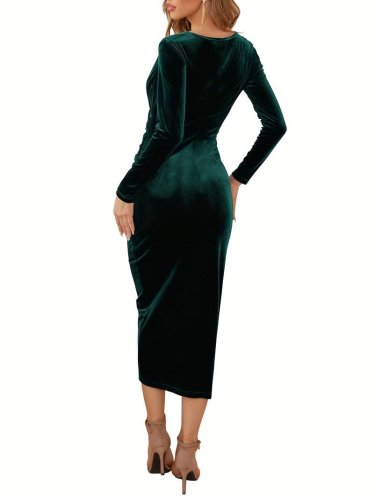 • Kadın uzun kollu kruvaze yaka belden büzgü detay midi kadife elbise