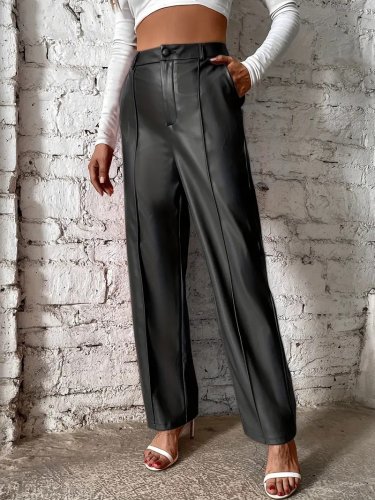 • Kadın önden fermuarlı cepli geniş kesim lame deri pantolon