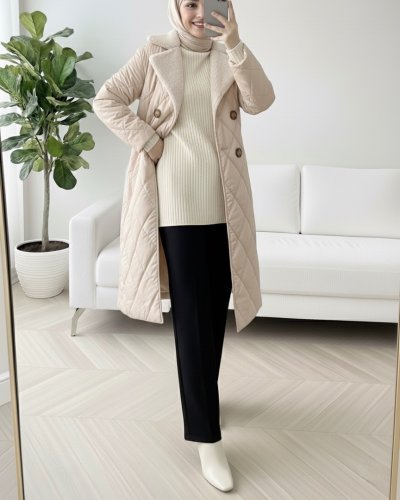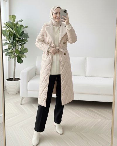 • Yakası Kürklü Beli Kemerli Düğmeli Astarlı Kapitone Mont Taş