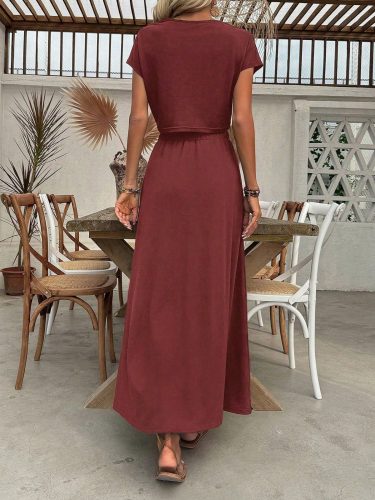 • Kadın kısa kollu bisiklet yaka viskon krop bluz ve uzun etek ikili takım