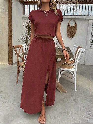 Kadın kısa kollu bisiklet yaka viskon krop bluz ve uzun etek ikili takım