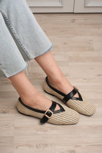 Ponti Siyah Cilt Hasır Detaylı Babet Ayakkabı