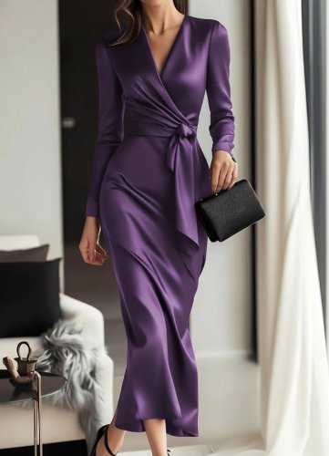 Kadın uzun kollu kruvaze yakalı beli kuşaklı uzun saten elbise